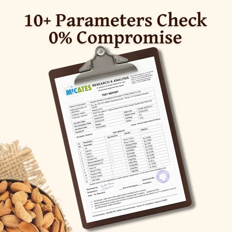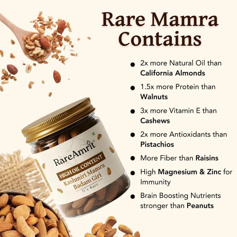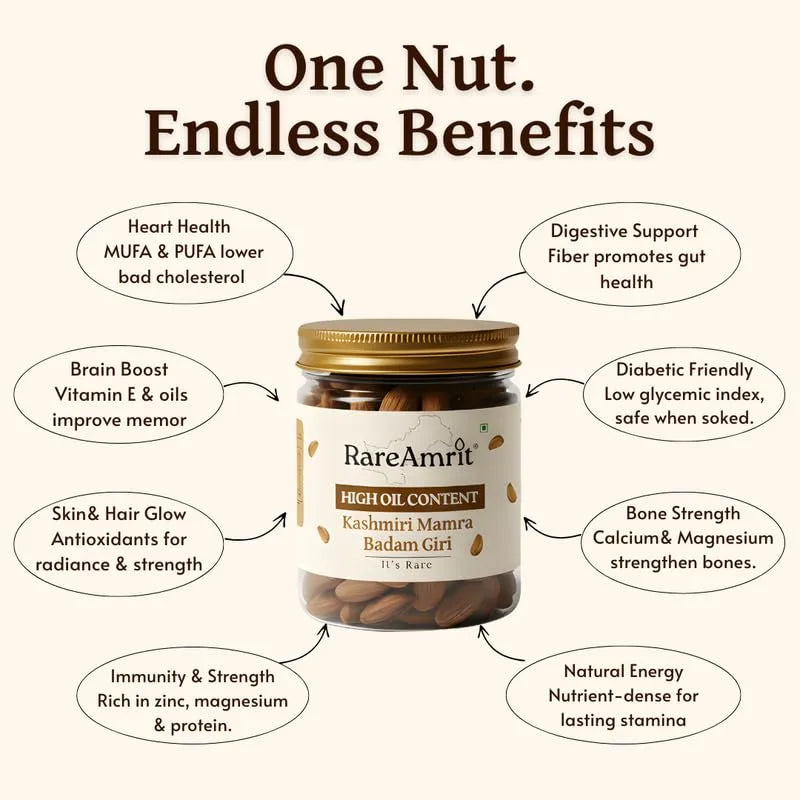 Rareamrit Kashmiri Mamra Almonds are completely different — hand-cracked, unprocessed, naturally high in oil, grown in the pristine orchards of Kashmir, and packed fresh at source.